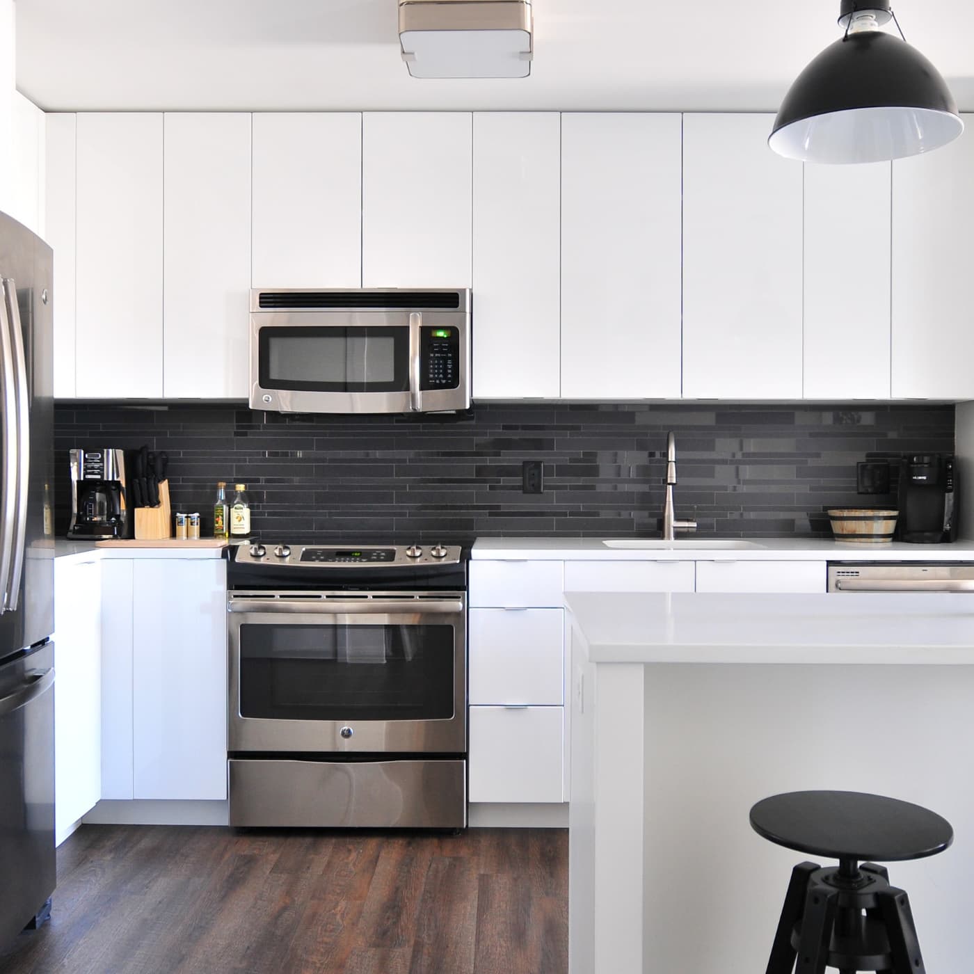 All installations follow professional techniques and safety standards for appliances, cabinetry, and worktops.